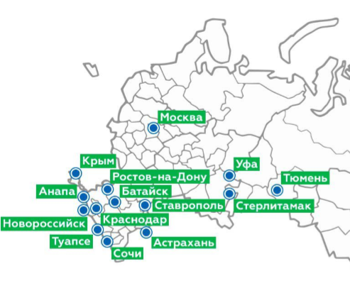Новороссийск, Анапа, Геленджик, Ставрополь, Краснодар, Уфа, Волгоград, Севастополь, Сочи, Астрахань, Ростов-на-Дону, Москва